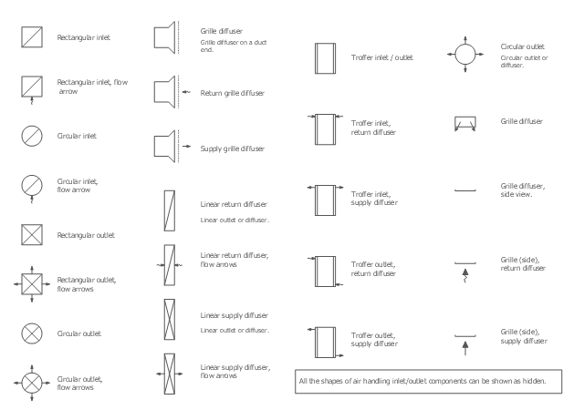 The vector stencils library Registers, drills and diffusers contains 47 symbols of rectangular, circular, linear and troffer air handling inlet/outlet components. Use the design elements library Registers, drills and diffusers to draw reflected ceiling plans (RCP) and HVAC layout floor plans using the ConceptDraw PRO diagramming and vector drawing software. "A ceiling is an overhead interior surface that covers the upper limit of a room. It is not generally considered a structural element, but a finished surface concealing the underside of the floor or roof structure above. Ceilings are classified according to their appearance or construction. A cathedral ceiling is any tall ceiling area similar to those in a church. A dropped ceiling is one in which the finished surface is constructed anywhere from a few inches to several feet below the structure above it. This may be done for aesthetic purposes, such as achieving a desirable ceiling height; or practical purposes such as providing a space for HVAC or piping. An inverse of this would be a raised floor. A concave or barrel shaped ceiling is curved or rounded, usually for visual or acoustical value, while a coffered ceiling is divided into a grid of recessed square or octagonal panels, also called a "lacunar ceiling". A cove ceiling uses a curved plaster transition between wall and ceiling; it is named for cove molding, a molding with a concave curve." [Ceiling. Wikipedia] "... reflected Ceiling Plans (RCP)s showing ceiling layouts appear after the floor plans." [Plan (drawing). Wikipedia] The shapes library "Registers, drills and diffusers" is contained in the Reflected Ceiling Plans solution from the Building Plans area of ConceptDraw Solution Park.
