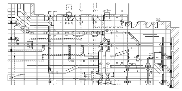 , wall, vertical duct, variable bend, duct, valve, transitioning, reducing, duct, text label, supply air grill, strainer, straight duct, return, duct, rectangular outlet, pipe flow arrow, flow indicating assembly, flexible, connection, double door, door, damper, automatic 2-way valve, Y junction, duct,