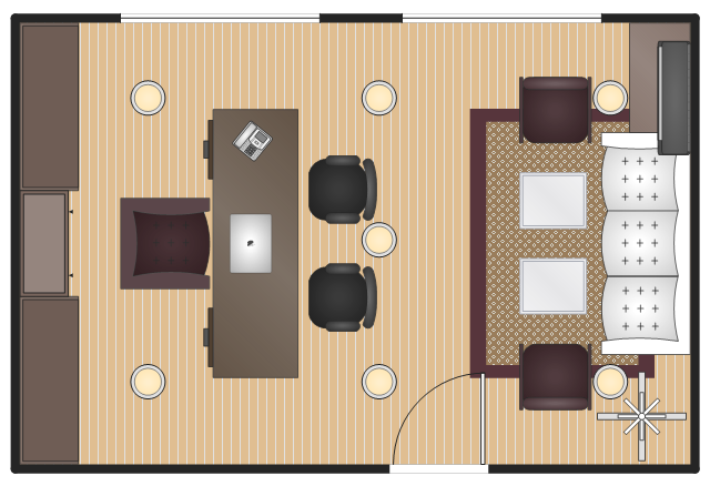 Layout example, window, casement, rectangular room, reception couch, hat and coat stand, guest chair, side chair with arms, side chair, chair, door, desk chair, desk, coffee table, buffet, hutch, bookcase, armchair, air conditioner, wall mounted, VoIP phone, MacBook Pro, LED ceiling lamp,