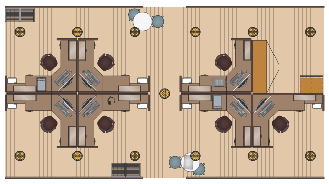 This office floorplan sample shows cubicles and office supplies layout. "A cubicle is a partially enclosed office workspace that is separated from neighboring workspaces by partitions that are usually 5–6 feet (1.5–1.8 m) tall. Its purpose is to isolate office workers and managers from the sights and noises of an open workspace so that they may concentrate with fewer distractions. Cubicles are composed of modular elements such as walls, work surfaces, overhead bins, drawers, and shelving, which can be configured depending on the user's needs. Installation is generally performed by trained personnel, although some cubicles allow configuration changes to be performed by users without specific training. Cubicles in the 2010s are usually equipped with a computer, monitor, keyboard and mouse on the work surface. Cubicles typically have a desk phone. Since many offices use overhead fluorescent lights to illuminate the office, cubicles may or may not have lamps or other additional lighting. Other furniture that is often used in cubicles includes an office chair, a filing cabinet for locking documents away, a bookcase and a coatrack." [Cubicle. Wikipedia] The floorplan example "Office cubicles plan" was created using ConceptDraw DIAGRAM software extended with Office Layout Plan solition from Building Plan area of ConceptDraw Solution Park.