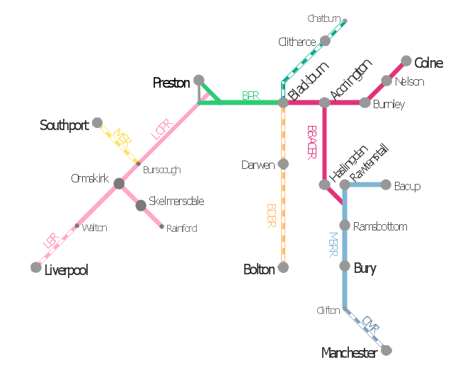 The example "ELR route map" was created using the ConceptDraw PRO diagramming and vector drawing software extended with the Metro Map solution from the Maps area of ConceptDraw Solution Park.