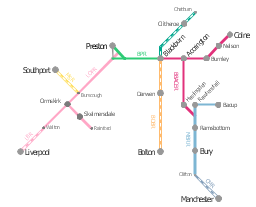 This is example of route map for the former East Lancashire Railway, in Lancashire, England.