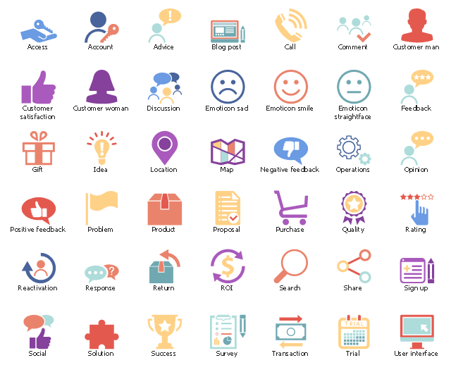 The vector stencils example "Design elements - Customer experience icons" is included in Customer Journey Mapping solution from Marketing area of ConceptDraw Solution Park.