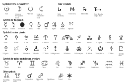 "Astronomical symbols are symbols used to represent various celestial objects, theoretical constructs and observational events in astronomy. The earliest forms of these symbols appear in Greek papyri of late antiquity. The Byzantine codices in which the Greek papyri were preserved continued and extended the inventory of astronomical symbols. New symbols were further invented to represent many just-discovered planets and minor planets discovered in the 18th-20th centuries.