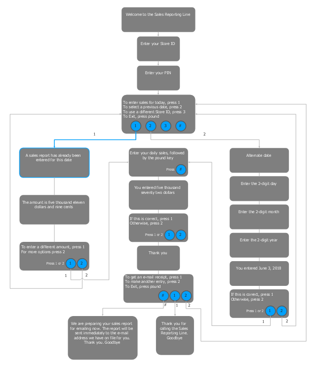 The IVR flowchart example "Store reporting" was created using the ConceptDraw PRO software extended with the Interactive Voice Response Diagrams solution from the Computer and Networks area of ConceptDraw Solution Park.