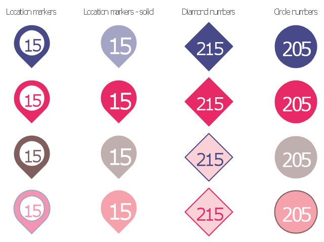 The vector stencils library "Numbers" contains 16 number blocks: location marker, diamond and circle shapes. Use it to add typography elements into your infographics.