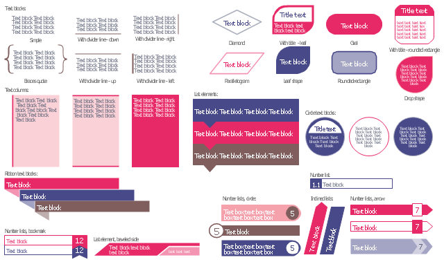 The vector stencils library "Text blocks" contains 38 text blocks including braces quote, blocks with divider line, text columns, list and numbered list elements, inclined list elements, blocks, different shape blocks (arrow, ribbon, circle, rounded rectangle, oval, diamond, parallelogram, leaf, drop), titled text blocks. Use it to add typography elements into your infographics.