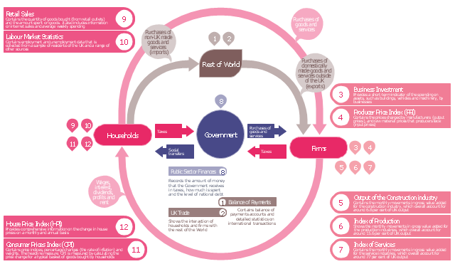 This typography infographics example was redesigned from the Wikimedia Commons file: How ONS statistics explain the UK economy Feb 2012 (8790240798).jpg. [commons.wikimedia.org/wiki/File:How_ONS_statistics_explain_the_UK_economy_Feb_2012_%288790240798%29.jpg] The circular flow of income shows how financial payments flow between firms and households within the economy. It also shows the interaction between different sectors of the economy and the rest of the world. Gross domestic product (GDP) measures the total output of the UK economy, and the quarterly national accounts build this into a complete picture of all the transactions shown in the graphic." [Office for National Statistics (ONS) website: ons.gov.uk/ons/interactive/ons-statistics-products/index.html] The infographics example "How ONS statistics explain the UK economy Feb 2012" was created using the ConceptDraw PRO diagramming and vector drawing software extended with the Typography Infographics solition from the area "What is infographics" in ConceptDraw Solution Park.