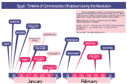 This typography infographics example was redesigned from the Wikimedia Commons file: Egypt timeline of communication shutdown during jan25revolution.jpg. [commons.wikimedia.org/wiki/File:Egypt_timeline_of_communication_shutdown_during_jan25revolution.jpg] This file is licensed under the Creative Commons Attribution 3.0 Unported license. [creativecommons.org/licenses/by/3.0/deed.en] Diagram to illustrate sequence of communications shutdown Egyptians went through from 25 January to 06 February 2011. Times mentioned are according to Egypt local time. Numbers in the diagram are approximate. Last update of the diagram October 2011. "2011 Internet shutdown. Diagram to illustrate sequence of communications shutdown Egyptians went through from 25 January to 06 February 2011. Times mentioned are according to Egypt local time. Numbers in the diagram are approximate. Last update of the diagram October 2011. The 2011 Egyptian protests began on 25 January 2011. As a result, on January 25 and 26, the government blocked Twitter in Egypt and later Facebook was blocked as well. On January 27, various reports claimed that access to the Internet in the entire country had been shut down. ... On February 2, connectivity was re-established by the four main Egyptian service providers. A week later, the heavy filtering that occurred at the height of the revolution had ended and bloggers and online activists who had been arrested were released." [Internet in Egypt. Wikipedia] The example "Egypt timeline of communication shutdown during jan 25 revolution" was created using the ConceptDraw PRO diagramming and vector drawing software extended with the Typography Infographics solition from the area "What is infographics" in ConceptDraw Solution Park.