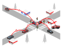 VANET diagram, store, signal light, lights, traffic light, road, petrol station, danger place, crosswalks, cell tower, car, appliance, ambulance,
