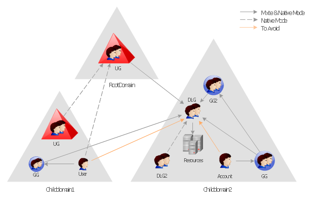 This Active Directory network diagram example depicts types of groups and people assignment rules.