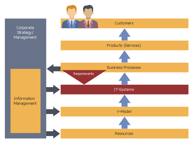 This workflow diagram example was designed on the base of the figure "Business Processes, IT Systems and V-Model" in the webpage "Lifecycle Process Model "V-Model. ... Connection between Business Process Reengineering and V-Model" on the website of the Computer Science, Faculty 3, Bremen University. [informatik.uni-bremen.de/gdpa/part3/p3gpo.htm]