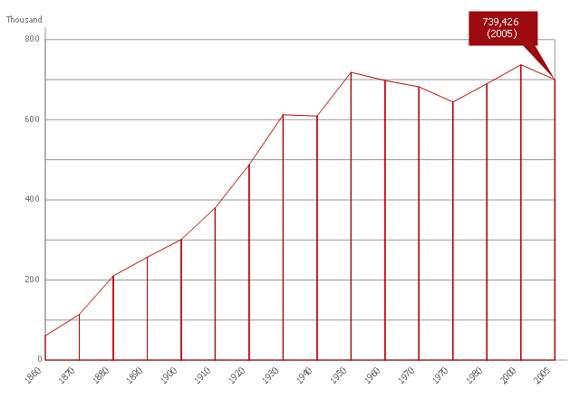 This area chart sample shows the population growth of San Francisco, California from 1850-2005. It was redesigned from the Wikimedia Commons file: San Francisco CA Population Growth.svg. [commons.wikimedia.org/wiki/File:San_Francisco_CA_Population_Growth.svg]