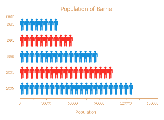This picture bar graph sample shows the Barrie population growth from 1981 to 2006. It was designed on the base of the Wikimedia Commons file: Barrie Population.jpg. [commons.wikimedia.org/wiki/File:Barrie_Population.jpg] "Barrie is a city in Central Ontario, Canada, on the western shore of Lake Simcoe. Although located in Simcoe County, the city is politically independent. Barrie is within the northern part of the Greater Golden Horseshoe, a densely populated and industrialized region of Ontario. In 2011 census, the city's population was originally reported as 135,711, making it the 34th largest in Canada. The city's 2011 population was subsequently revised to 136,063. The Barrie census metropolitan area (CMA) had a population of 187,013 residents, making it the 21st largest CMA in Canada." [Barrie. Wikipedia] The pictorial chart example "Barrie population" was created using the ConceptDraw PRO diagramming and vector drawing software extended with the Picture Graphs solution from the Graphs and Charts area of ConceptDraw Solution Park.