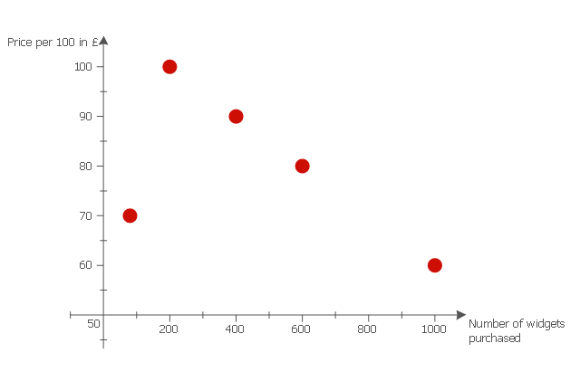 This scatter graph sample illustrates correlation between price per 100 widgets in pound sterling and number of widgets purchased. "Correlation. Correlation measures the strength of association between two variables. We will first consider the relationship between two scalar variables and then between ranked variables. Pearson correlation coefficient. Pearson's R indicates the strength and direction of association between two scalar variables, ranging from -1 which indicates a strong inverse relationship and 1 indicating a strong direct relationship. At 0 we say there is no correlation; it measures the linear dependence of one variable on another. Linear dependence means that one variable can be computed from the other by a linear equation ... An inverse correlation. In the following data we see that as the number of widgets rises, the price per 100 widgets falls. This is an inverse correlation and has a negative value for Pearson's R. ... For this data the correlation coefficient has a value of -1." [en.wikibooks.org/wiki/Statistics_Ground_Zero/Association] The scatter chart example "Widgets price" was created using the ConceptDraw PRO diagramming and vector drawing software extended with the Scatter Diagrams solution from the Graphs and Charts area of ConceptDraw Solution Park.