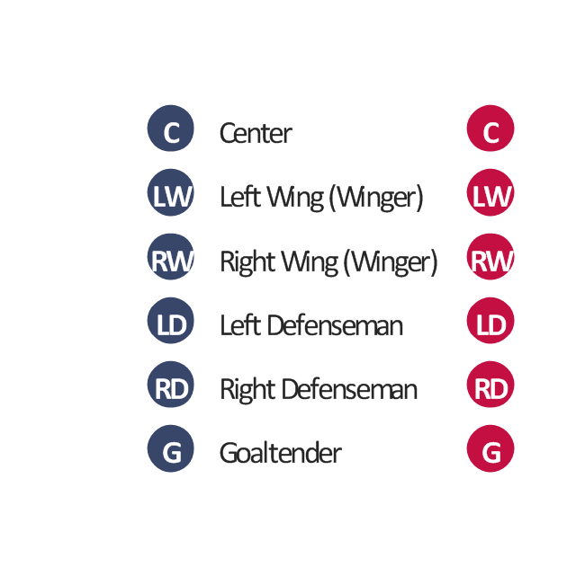 Ice hockey player symbols, right wing, right winger, winger, right defenseman, defense, defenceman, left wing, left winger, winger, goaltender, goalie, center, centre ice hockey, ;eft defenseman, defense, defenceman,
