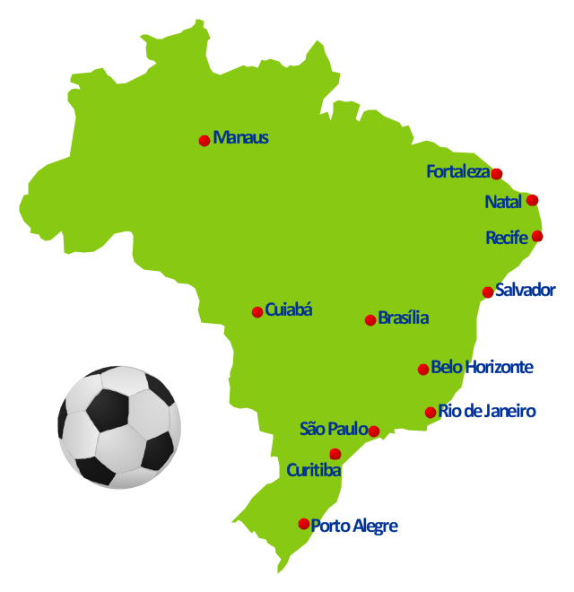 This spatial infographics example was created on the base of Brazil location map from the Wikipedia article "2014 FIFA World Cup". [en.wikipedia.org/wiki/2014_FIFA_World_Cup] "The 2014 FIFA World Cup will be the 20th FIFA World Cup, an international men's football tournament that is scheduled to take place in Brazil from 12 June to 13 July 2014. ... Eighteen locations were presented as potential World Cup host cities: Belém, Belo Horizonte, Brasília, Campo Grande, Cuiabá, Curitiba, Florianópolis, Fortaleza, Goiânia, Maceió, Manaus, Natal, Porto Alegre, Recife, Rio Branco, Rio de Janeiro, Salvador and São Paulo." [2014 FIFA World Cup. Wikipedia] The geospatial infographics example "2014 FIFA World Cup - Brazil location map" was created using the ConceptDraw PRO diagramming and vector drawing software extended with the Soccer solution from the Sport area of ConceptDraw Solution Park.