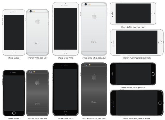 The vector stencils library "iPhone 6 mockup" contains 12 iPhone 6 and iPhone 6 Plus images. Use the library "iPhone 6 mockup" to draw iPhone 6 mockup elements for design of software applications user interface sketches and prototypes. The iPhone 6 and iPhone 6 Plus images sample "Design elements - iPhone 6 mockup" was created using the ConceptDraw PRO diagramming and vector drawing software extended with the iPhone User Interface solution from the Software Development area of ConceptDraw Solution Park.