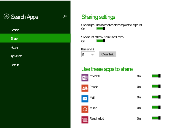 Sharing settings screen