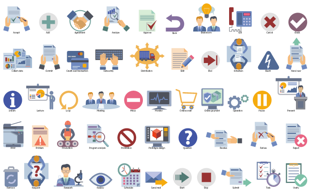 Icon set, verify, truck, task, submit, stop, start, send mail, schedule, review, research, request, remove, waste bin, reject, refuse, receive, question sign, question, prototype design, modeling, prototyping, prohibition, program analysis, production, manufacturing, problem, print, office printer, present, pause, operation, online payment, online order, monitor, minus, meeting, loop, light bulb, lecture, inform, hand over, event, entertain, end, edit, distribution, data entry, keyboard, credit card transaction, commit, collect data, check, cancel, call, brainstorm, back, approve, analyze, agreement, add, accept,