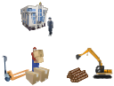 Vector illustration, wood, loading workman, forklift truck, excavator, customs officer, customs office, cardboard, box,