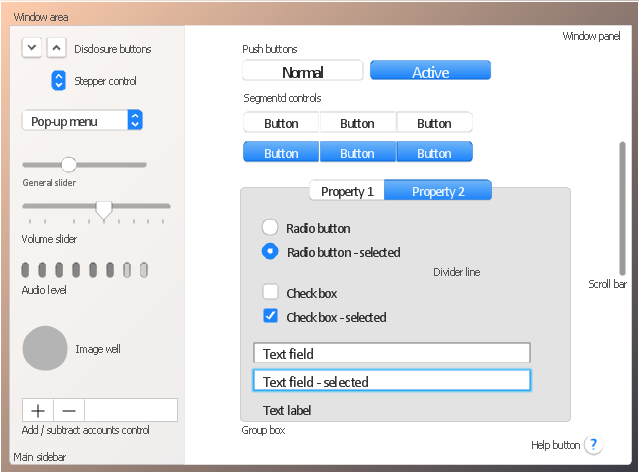 The example "Design elements - General window elements" was created using the ConceptDraw PRO diagramming and vector drawing software extended with the Mac OS User Interface solution from the Software Development area of ConceptDraw Solution Park.