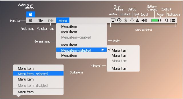 The UI icons example "Design elements - Menus" was created using the ConceptDraw PRO diagramming and vector drawing software extended with the Mac OS User Interface solution from the Software Development area of ConceptDraw Solution Park.