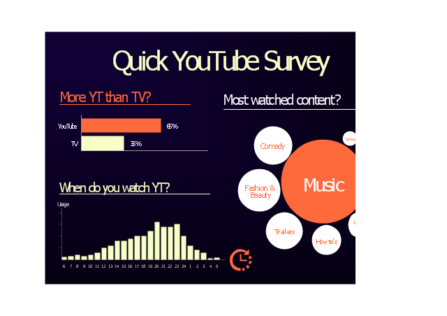 The column chart and bar graph sample "Quick YouTube Survey" was created using the ConceptDraw PRO diagramming and vector graphics software extended with the Data-driven Infographics" solution from the area "What is infographics" of ConceptDraw Solution Park.