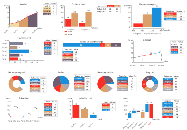 The vector stencils library "Data-driven Charts" contains 13 data-driven charts: pie charts, line graphs, bar charts.
