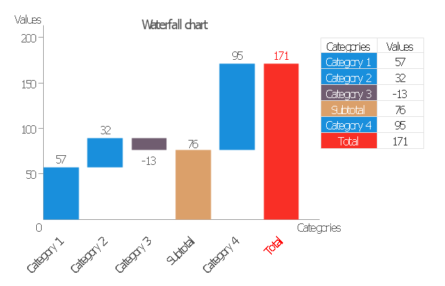 The vector stencils library "Data-driven charts" contains 13 data-driven graphs and charts: area chart, divided bar diagram, double bar graph, frequency histogram, horizontal bar chart, line graph, percentage ring chart, percentage pie chart, scatter plot, column chart, waterfall chart.
