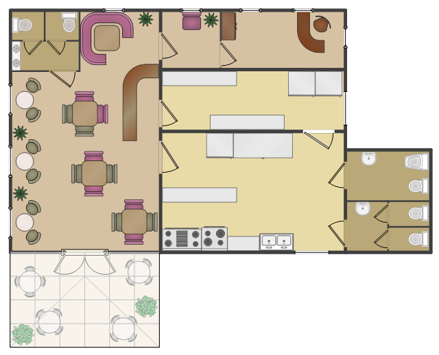 The floor plan sample "Cafe layout" was created using ConceptDraw PRO diagramming and vector drawing software extended with the Cafe and Restaurant solution from Building Plans area of ConceptDraw Solution Park.