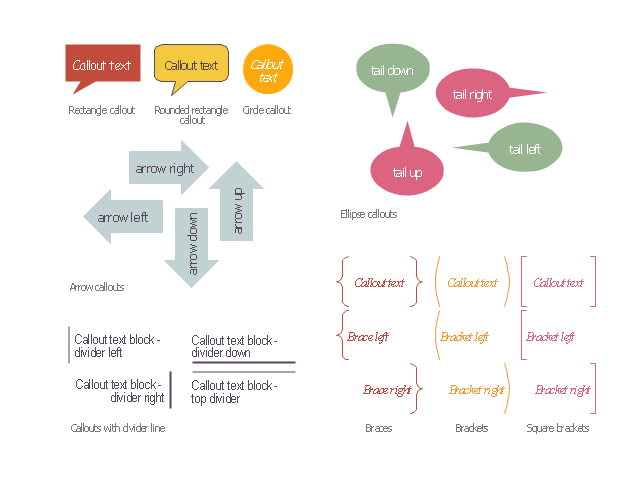 The vector stencils library "Education callouts" contains 24 shapes of callouts, speech balloons, arrows, braces and brackets.