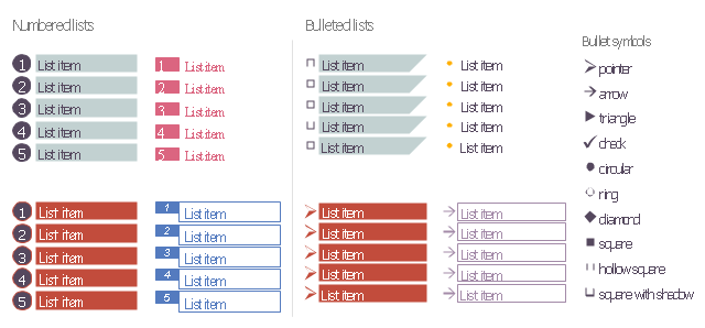 The vector stencils library "Education list blocks" contains 18 list block shapes: numbered list, bulleted list, bullets. Use these list blocks to design your educational infograms. "In typography, a bullet is a typographical symbol or glyph used to introduce items in a list. ... The bullet symbol may take any of a variety of shapes, such as circular, square, diamond, arrow, etc. ... Bullets are most often used in technical writing, reference works, notes and presentations. ... Bulleted items – known as "bullet points" – may be short phrases, single sentences, or of paragraph length. Bulleted items are not usually terminated with a full stop if they are not complete sentences, although it is not rare to terminate every item except the last one with a semicolon, and terminate the last item with a full stop. It is correct to terminate a bullet point with a full stop if the text within that item consists of one 'full' sentence or more." [Bullet (typography). Wikipedia] The shapes example "Design elements - Education list blocks" was created using the ConceptDraw PRO diagramming and vector drawing software extended with the Education Infographics solition from the area "Business Infographics" in ConceptDraw Solution Park.