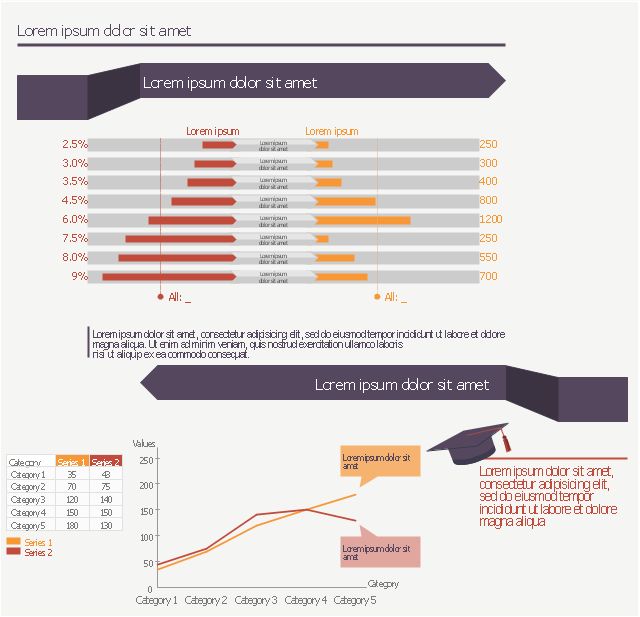This education infographic template consists of design elements: callouts, bullet indicators, line chart, graduate cap pictogram. Simply add text and data to design your educational infogram. The template "Education infogram" for the ConceptDraw PRO diagramming and vector drawing software is included in the Education Infographics solition from the area "Business Infographics" in ConceptDraw Solution Park.