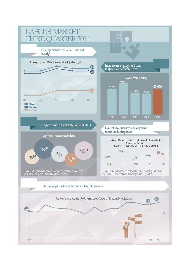 This example was designed on the base of "Infographic: Labour Market, Third Quarter 2014" from website of the Ministry of Manpower in the Government of Singapore.