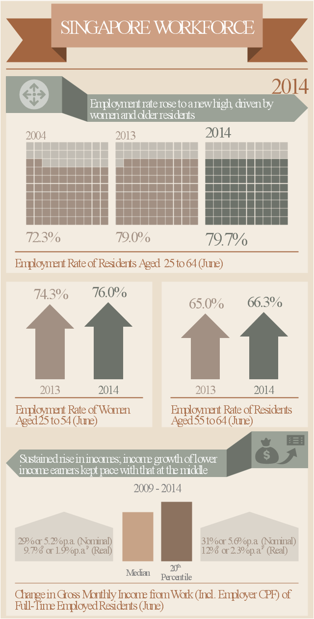 This example was designed on the base of "Infographic: Singapore Workforce, 2014" from website of the Ministry of Manpower in the Singapore Government. [stats.mom.gov.sg/Pages/Singapore-Workforce-2014-Infographic.aspx]