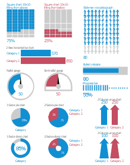 Graphic indicators, two columns arrow chart indicator, two bars horizontal bar chart indicator, stickman row pictograph, square chart 10x10 indicator, semi-radial gauge, speedometer gauge, ring chart indicator, donut chart indicator, radial gauge indicator, speedometer indicator, progress bar indicator, discrete horizontal level indicator, pie chart indicator, donut chart indicator, bullet indicator,