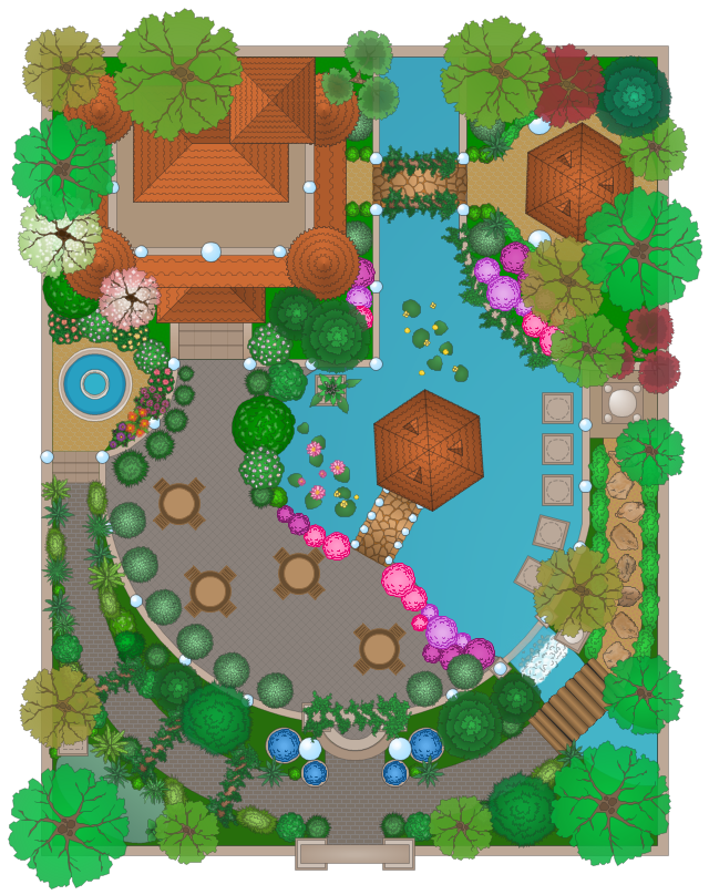 This example of moorish garden design shows ornamental trees, bushes, flowers, pools, fontain, garden furniture, wall with gate, and building layout. "Traditionally, an Islamic garden is a cool place of rest and reflection, and a reminder of paradise. ... The general theme of a traditional Islamic garden is water and shade, not surprisingly since Islam came from and generally spread in a hot and arid climate. Unlike English gardens, which are often designed for walking, Islamic gardens are intended for rest and contemplation. For this reason, Islamic gardens usually include places for sitting." [Islamic garden. Wikipedia] The landscape design sample "Moresque garden" was created using the ConceptDraw PRO diagramming and vector drawing software extended with the Landscape and Garden solution from the Building Plans area of ConceptDraw Solution Park.