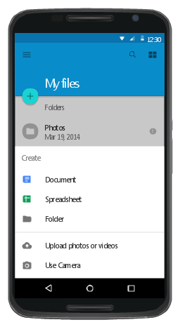 This Android 5 UI design example shows My Files screen of Google Nexus 6 smartphone. The user interface design example "Android 5.0 - List-style bottom sheet" was created using the ConceptDraw PRO diagramming and vector drawing software extended with the "Android user interface" solution from the "Software Development" area of ConceptDraw Solution Park.