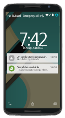 Lock screen notifications UI, warning icon, timestamp, signal wifi statusbar 4 bar icon, signal cellular null icon, shop two icon, photo camera icon, notifications, notification title, notification message, lock open icon, dimmed background, contracted notification, time-sensitive notification, call icon, battery full icon, avatar, photo, account circle icon, Nexus 6, Android wallpapers,