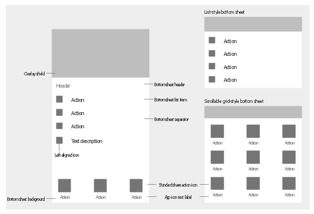 The vector stencils library "Android bottom sheets" contains 11 bottom sheet elements. Use it to design user interface of your Android application. The shapes example "Design elements - Android bottom sheets" was created using the ConceptDraw PRO diagramming and vector drawing software extended with the "Android user interface" solution from the "Software Development" area of ConceptDraw Solution Park.