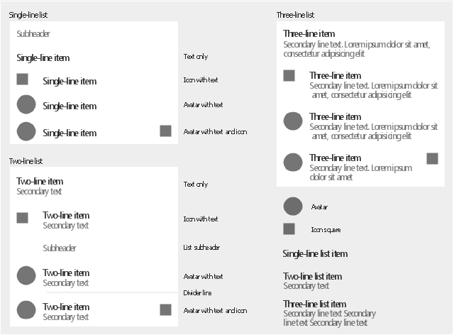 List elements, two-line list, three-line list, single-line list, list subheader, list item, list divider, icon square, avatar,