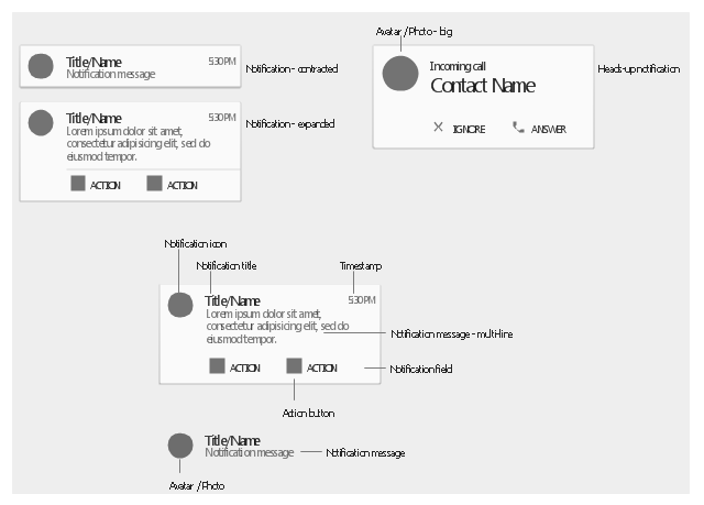 The vector stencils library "Android notifications" contains 12 notification elements. Use it to design user interface of your Android application. The shapes example "Design elements - Android notifications" was created using the ConceptDraw PRO diagramming and vector drawing software extended with the "Android user interface" solution from the "Software Development" area of ConceptDraw Solution Park.