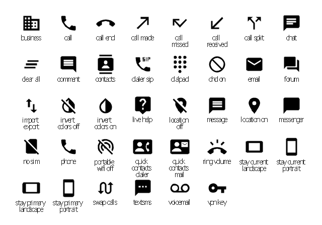 The icons example "Design elements - Android system icons (communication)" was created using the ConceptDraw PRO diagramming and vector drawing software extended with the "Android user interface" solution from the "Software Development" area of ConceptDraw Solution Park.