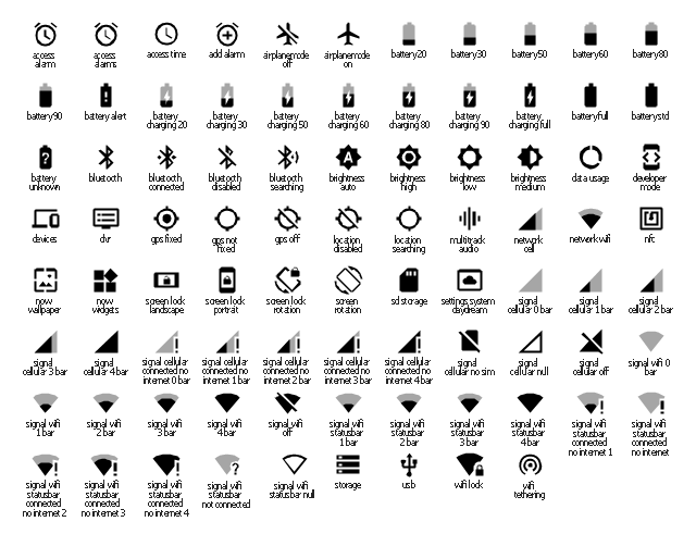 The icons example "Design elements - Android system icons (device)" was created using the ConceptDraw PRO diagramming and vector drawing software extended with the "Android user interface" solution from the "Software Development" area of ConceptDraw Solution Park.
