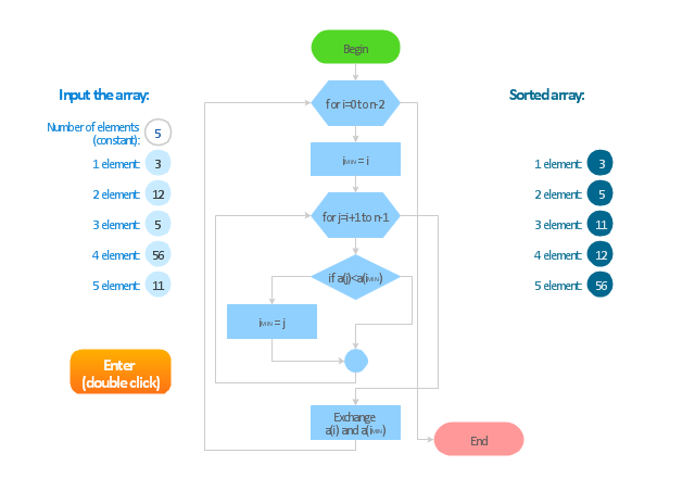 The algorithm flow chart example "Selection sorting method" was created using the ConceptDraw PRO diagramming and vector drawing software extended with the Flowcharts solution from the area "What is a Diagram" of ConceptDraw Solution Park.