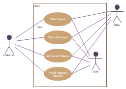 Each stick person represents an “actor,” which is typically a human or some other kind of free agent. (These can even be other computer systems, as is the case with “ATM.”) The box represents the boundary of your system. The ellipses represent the use cases, which are descriptions of valuable work that can be performed with the system. The lines between the actors and the use cases represent the interactions.