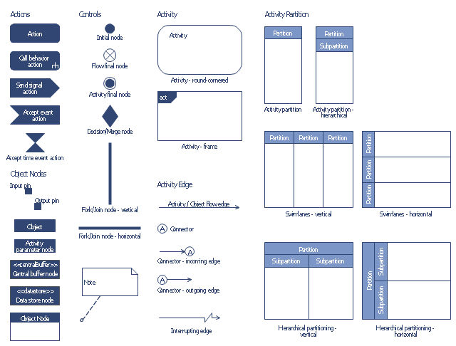 This example of UML activity diagram symbols for the ConceptDraw PRO diagramming and vector drawing software is included in the ATM UML Diagrams solution from the Software Development area of ConceptDraw Solution Park.