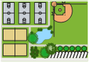 Pitches site plan, volleyball court, succulent, potted plant, parking strip, kidney-shaped pool, pool, deciduous tree, deciduous shrub, corner curb, broadleaf evergreen tree, basketball court, baseball diamonds,