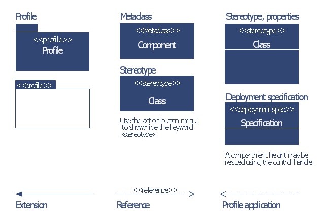 "A profile diagram operates at the metamodel level to show stereotypes as classes with the <<stereotype>> stereotype, and profiles as packages with the <<profile>> stereotype. The extension relation (solid line with closed, filled arrowhead) indicates what metamodel element a given stereotype is extending." [Profile diagram. Wikipedia]